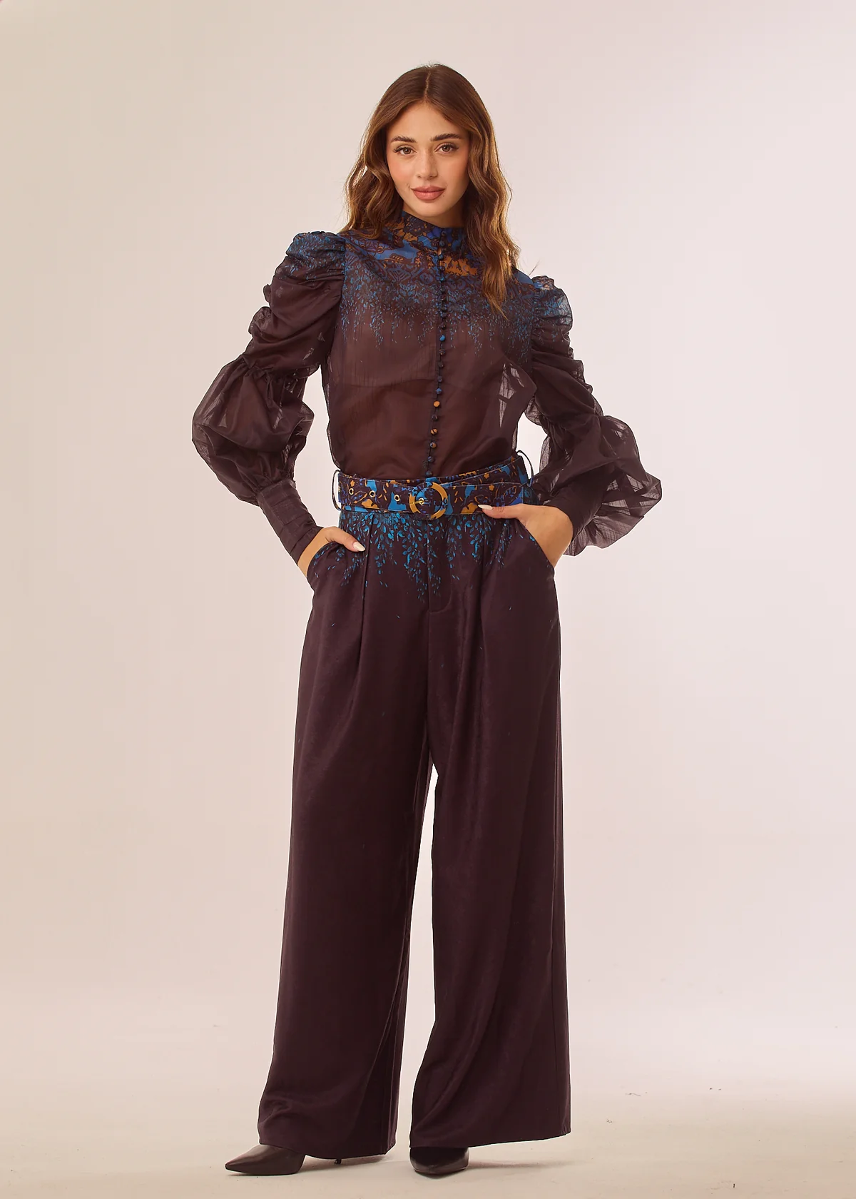 Completo fantasia con camicia in organza e pantaloni in camoscio.