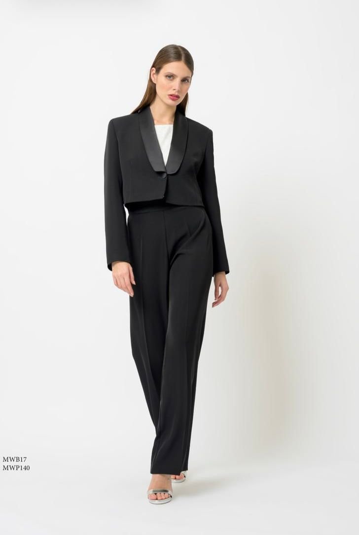Tailleur giacca corta mono petto con collo in raso pant modello uomo morbido.